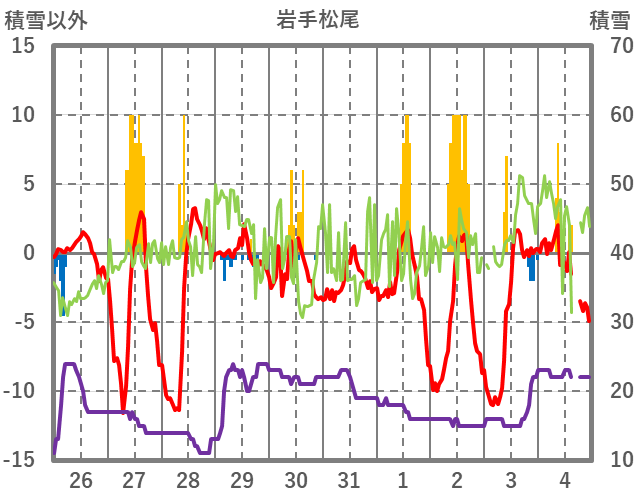 | 日 | 時 | 気温 | 降水 | 風向/風速 | 日照 | 積雪 | 降雪 |