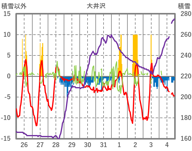 | 日 | 時 | 気温 | 降水 | 風向/風速 | 日照 | 積雪 | 降雪 |