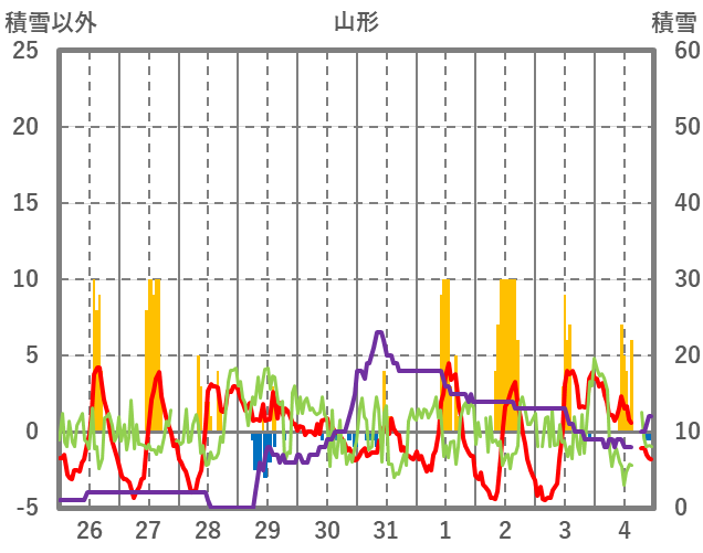 | 日 | 時 | 気温 | 降水 | 風向/風速 | 日照 | 積雪 | 降雪 |