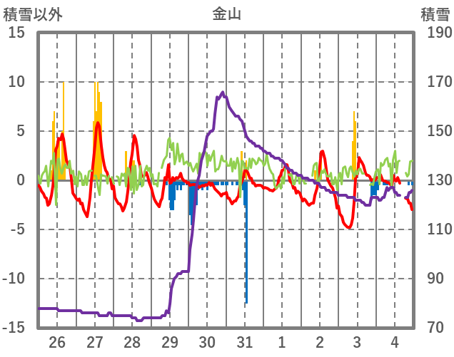 | 日 | 時 | 気温 | 降水 | 風向/風速 | 日照 | 積雪 | 降雪 |