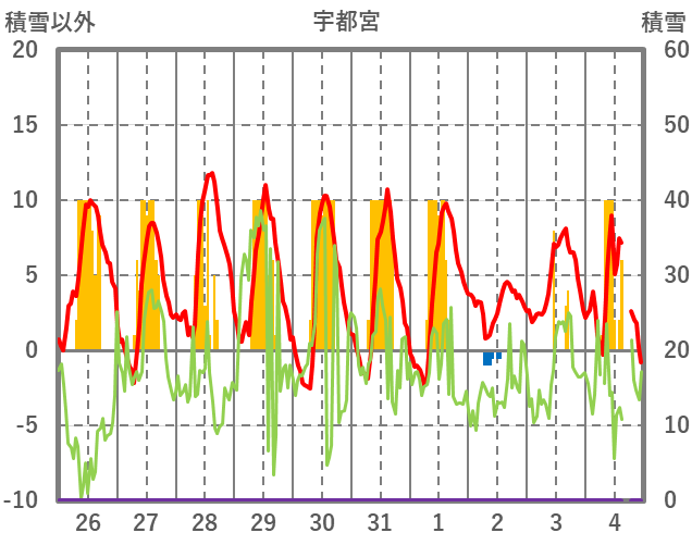 | 日 | 時 | 気温 | 降水 | 風向/風速 | 日照 | 積雪 | 降雪 |