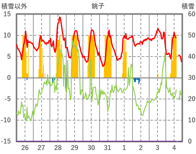 | 日 | 時 | 気温 | 降水 | 風向/風速 | 日照 | 積雪 | 降雪 |