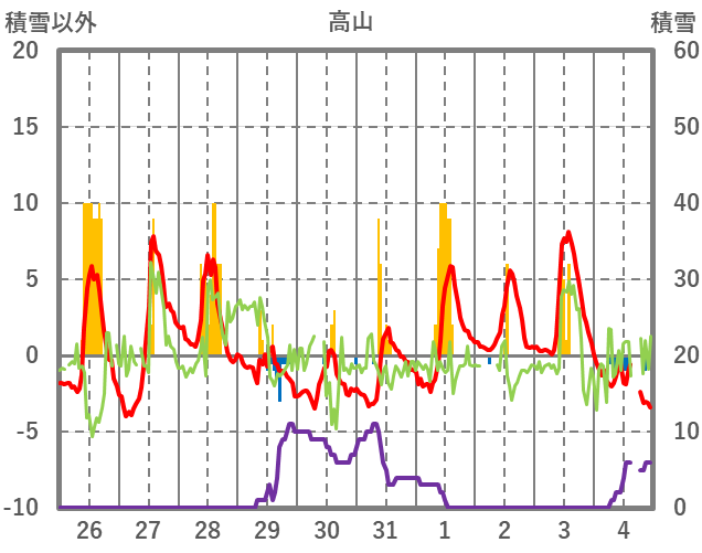 | 日 | 時 | 気温 | 降水 | 風向/風速 | 日照 | 積雪 | 降雪 |