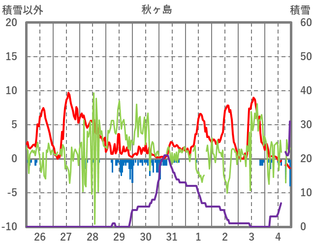 | 日 | 時 | 気温 | 降水 | 風向/風速 | 日照 | 積雪 | 降雪 |
