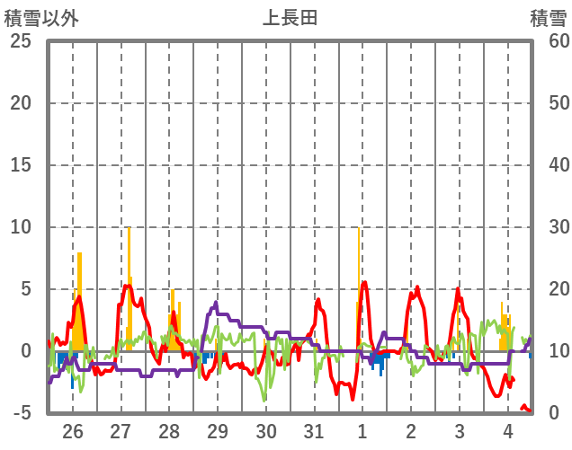 | 日 | 時 | 気温 | 降水 | 風向/風速 | 日照 | 積雪 | 降雪 |