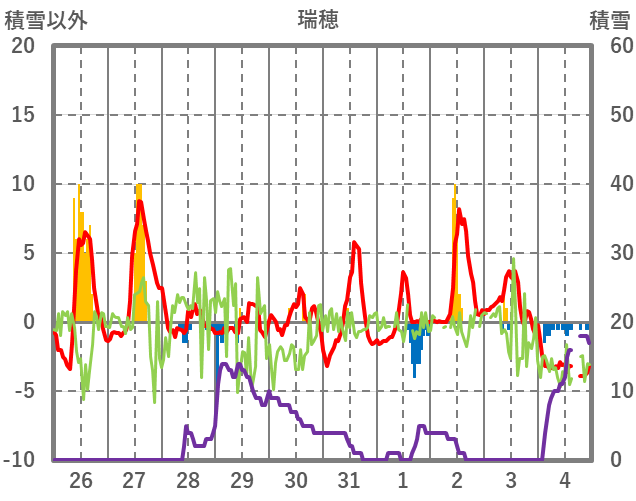 | 日 | 時 | 気温 | 降水 | 風向/風速 | 日照 | 積雪 | 降雪 |