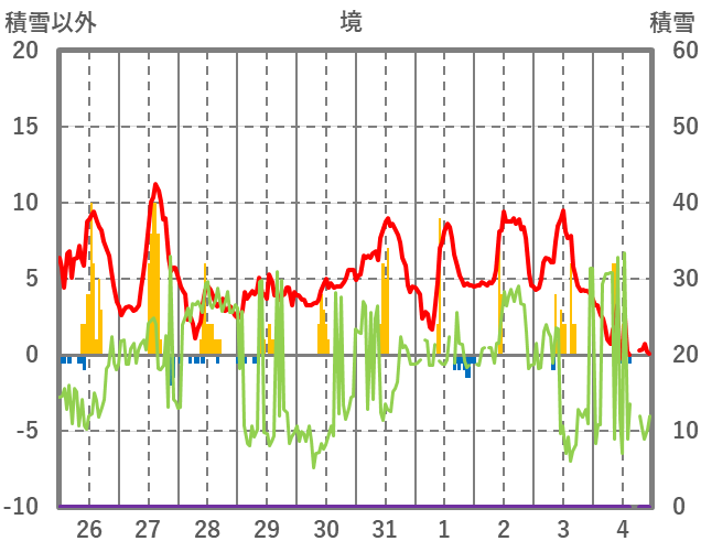 | 日 | 時 | 気温 | 降水 | 風向/風速 | 日照 | 積雪 | 降雪 |