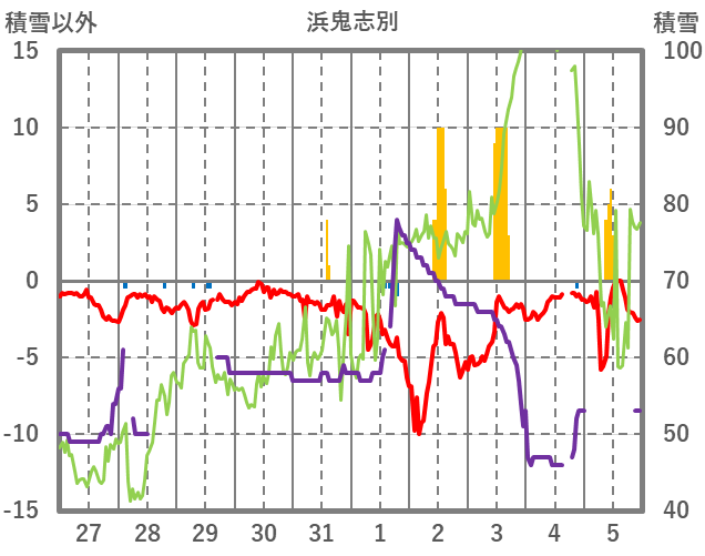 | 日 | 時 | 気温 | 降水 | 風向/風速 | 日照 | 積雪 | 降雪 |
