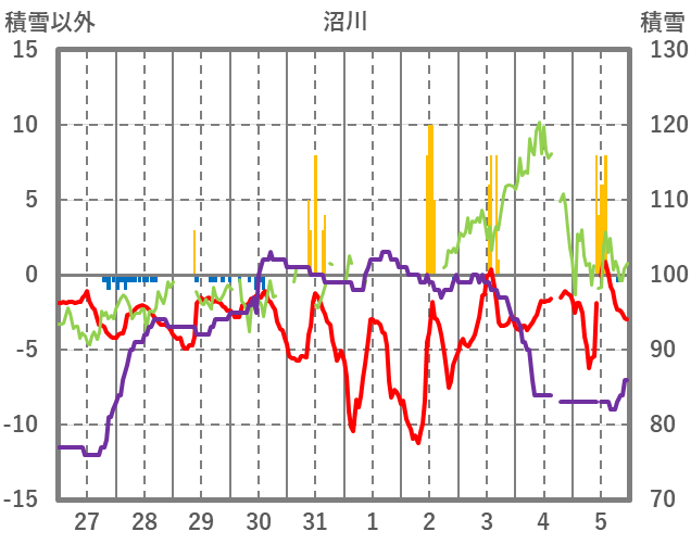 | 日 | 時 | 気温 | 降水 | 風向/風速 | 日照 | 積雪 | 降雪 |