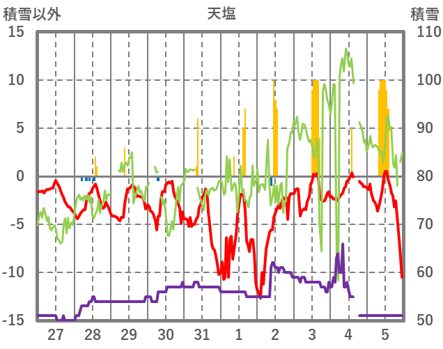 | 日 | 時 | 気温 | 降水 | 風向/風速 | 日照 | 積雪 | 降雪 |