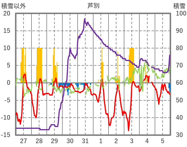 | 日 | 時 | 気温 | 降水 | 風向/風速 | 日照 | 積雪 | 降雪 |
