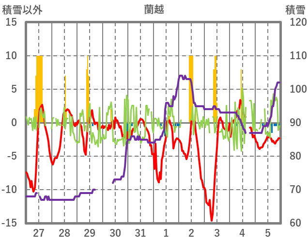| 日 | 時 | 気温 | 降水 | 風向/風速 | 日照 | 積雪 | 降雪 |
