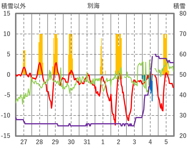 | 日 | 時 | 気温 | 降水 | 風向/風速 | 日照 | 積雪 | 降雪 |