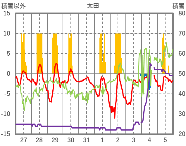 | 日 | 時 | 気温 | 降水 | 風向/風速 | 日照 | 積雪 | 降雪 |