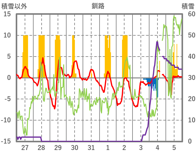 | 日 | 時 | 気温 | 降水 | 風向/風速 | 日照 | 積雪 | 降雪 |