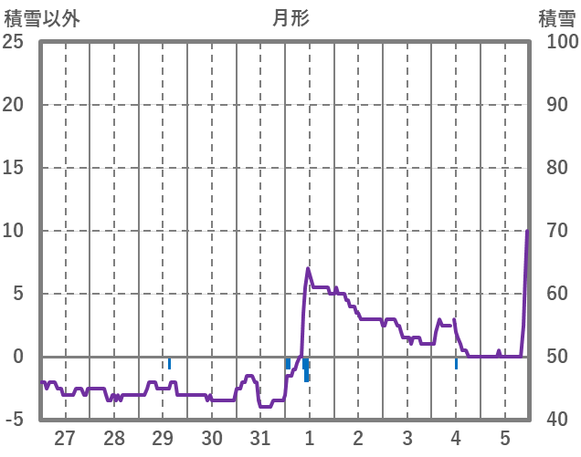 | 日 | 時 | 気温 | 降水 | 風向/風速 | 日照 | 積雪 | 降雪 |