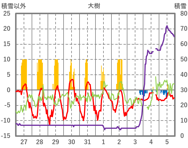 | 日 | 時 | 気温 | 降水 | 風向/風速 | 日照 | 積雪 | 降雪 |