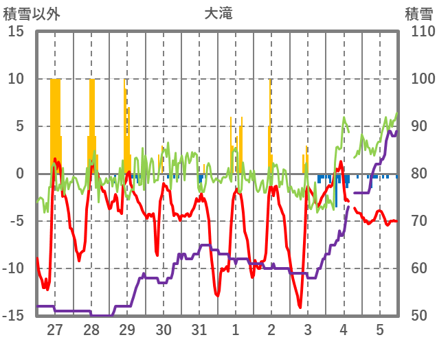 | 日 | 時 | 気温 | 降水 | 風向/風速 | 日照 | 積雪 | 降雪 |