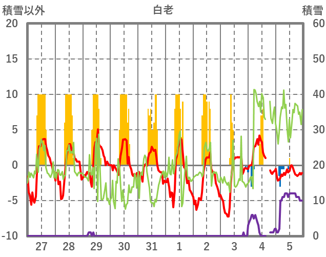 | 日 | 時 | 気温 | 降水 | 風向/風速 | 日照 | 積雪 | 降雪 |