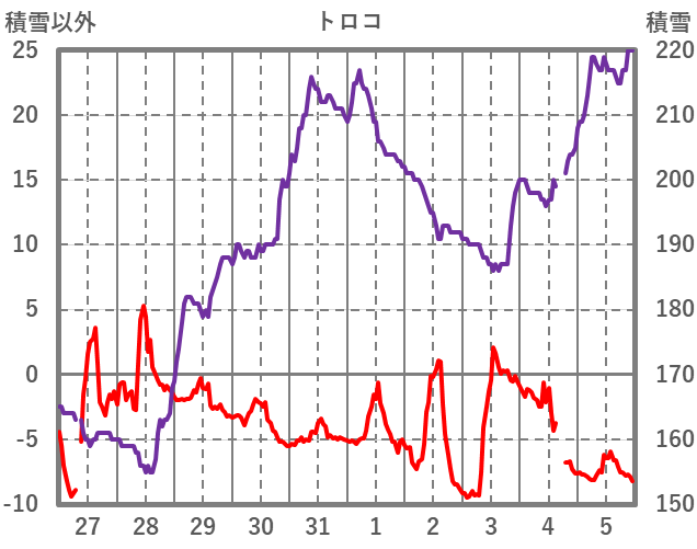 | 日 | 時 | 気温 | 降水 | 風向/風速 | 日照 | 積雪 | 降雪 |