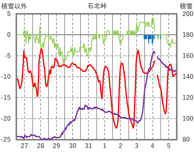 | 日 | 時 | 気温 | 降水 | 風向/風速 | 日照 | 積雪 | 降雪 |