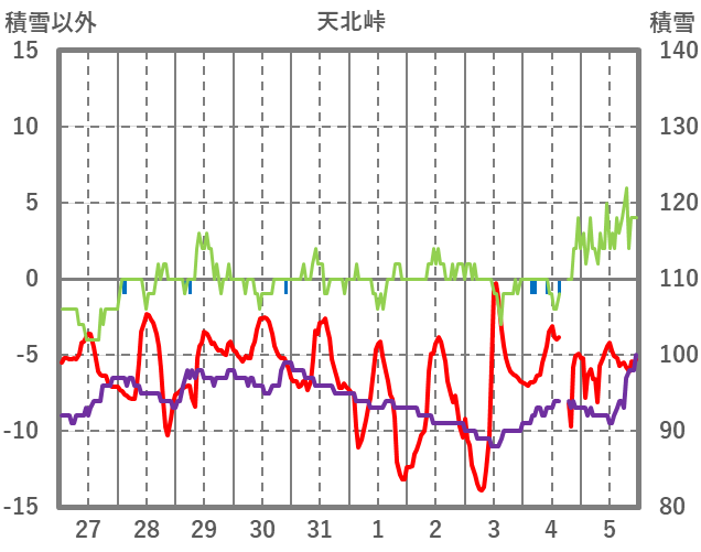 | 日 | 時 | 気温 | 降水 | 風向/風速 | 日照 | 積雪 | 降雪 |