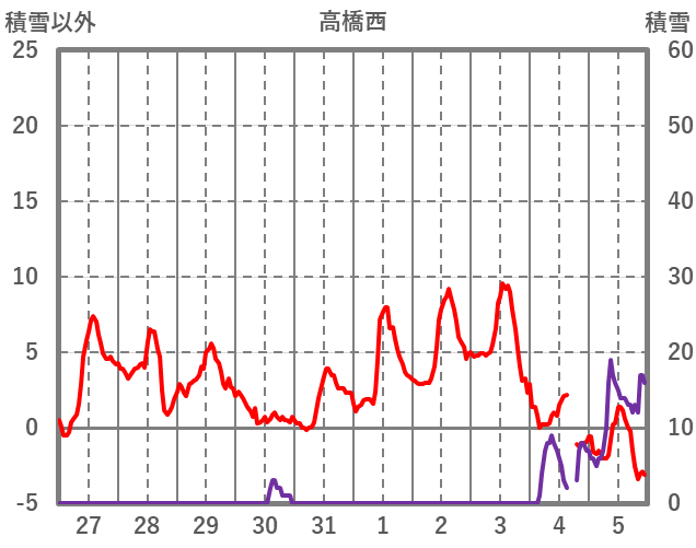 | 日 | 時 | 気温 | 降水 | 風向/風速 | 日照 | 積雪 | 降雪 |