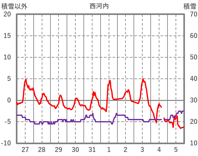 | 日 | 時 | 気温 | 降水 | 風向/風速 | 日照 | 積雪 | 降雪 |