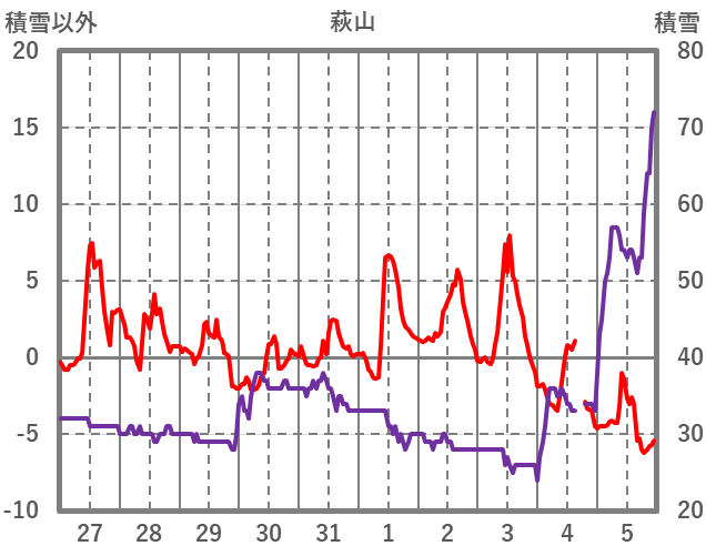| 日 | 時 | 気温 | 降水 | 風向/風速 | 日照 | 積雪 | 降雪 |