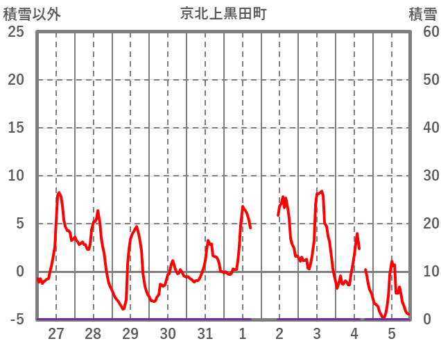 | 日 | 時 | 気温 | 降水 | 風向/風速 | 日照 | 積雪 | 降雪 |