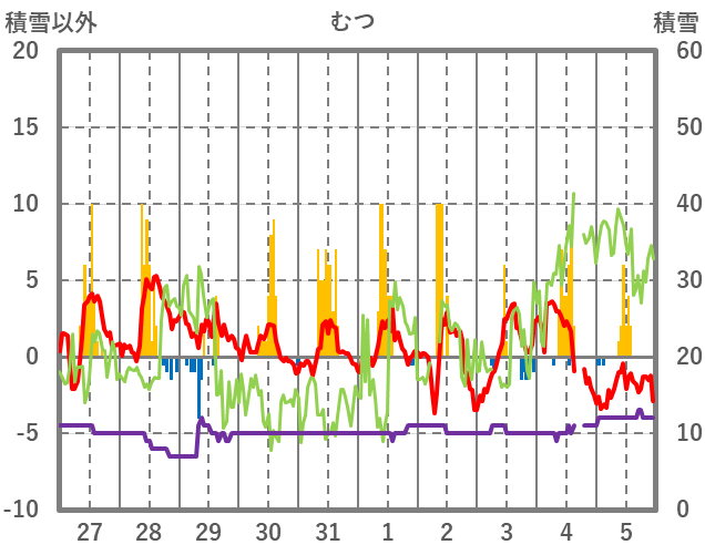 | 日 | 時 | 気温 | 降水 | 風向/風速 | 日照 | 積雪 | 降雪 |