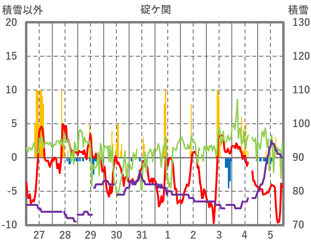 | 日 | 時 | 気温 | 降水 | 風向/風速 | 日照 | 積雪 | 降雪 |