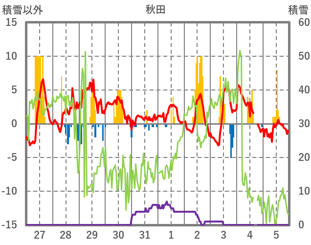 | 日 | 時 | 気温 | 降水 | 風向/風速 | 日照 | 積雪 | 降雪 |