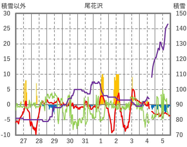 | 日 | 時 | 気温 | 降水 | 風向/風速 | 日照 | 積雪 | 降雪 |