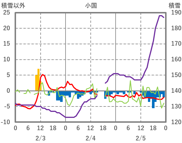| 日 | 時 | 気温 | 降水 | 風向/風速 | 日照 | 積雪 | 降雪 |