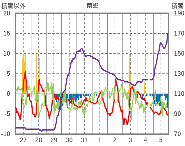 | 日 | 時 | 気温 | 降水 | 風向/風速 | 日照 | 積雪 | 降雪 |