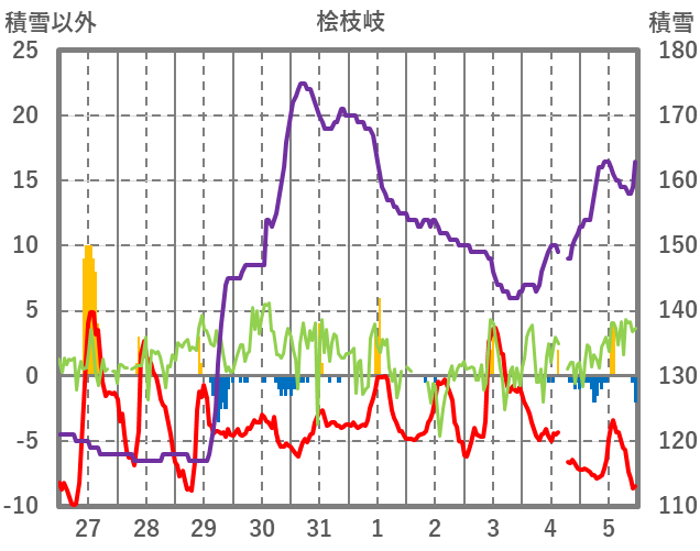| 日 | 時 | 気温 | 降水 | 風向/風速 | 日照 | 積雪 | 降雪 |