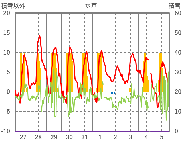 | 日 | 時 | 気温 | 降水 | 風向/風速 | 日照 | 積雪 | 降雪 |