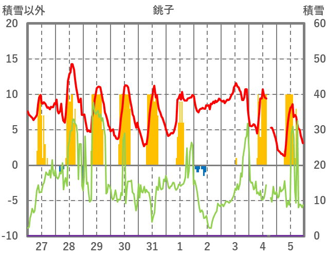 | 日 | 時 | 気温 | 降水 | 風向/風速 | 日照 | 積雪 | 降雪 |
