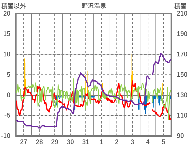 | 日 | 時 | 気温 | 降水 | 風向/風速 | 日照 | 積雪 | 降雪 |