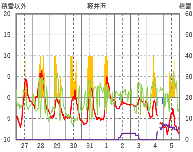 | 日 | 時 | 気温 | 降水 | 風向/風速 | 日照 | 積雪 | 降雪 |