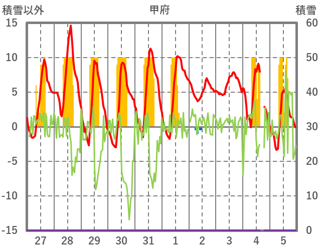 | 日 | 時 | 気温 | 降水 | 風向/風速 | 日照 | 積雪 | 降雪 |