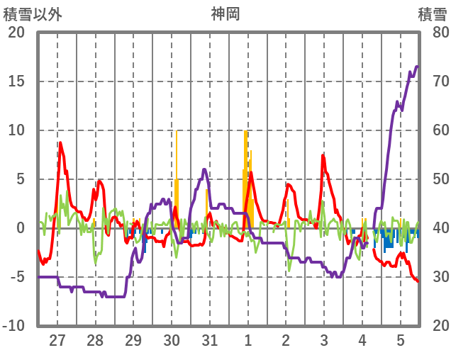 | 日 | 時 | 気温 | 降水 | 風向/風速 | 日照 | 積雪 | 降雪 |