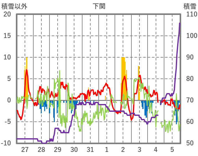 | 日 | 時 | 気温 | 降水 | 風向/風速 | 日照 | 積雪 | 降雪 |