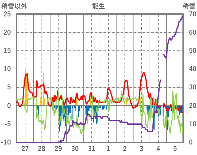 | 日 | 時 | 気温 | 降水 | 風向/風速 | 日照 | 積雪 | 降雪 |