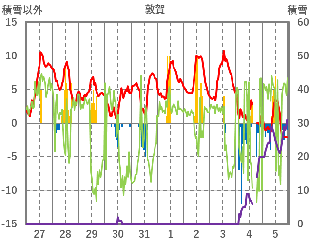 | 日 | 時 | 気温 | 降水 | 風向/風速 | 日照 | 積雪 | 降雪 |