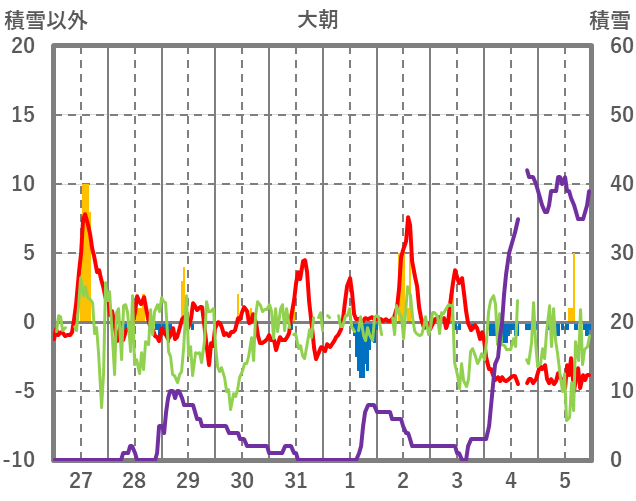 | 日 | 時 | 気温 | 降水 | 風向/風速 | 日照 | 積雪 | 降雪 |