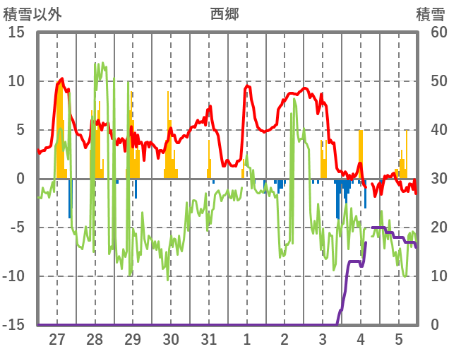 | 日 | 時 | 気温 | 降水 | 風向/風速 | 日照 | 積雪 | 降雪 |