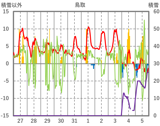 | 日 | 時 | 気温 | 降水 | 風向/風速 | 日照 | 積雪 | 降雪 |