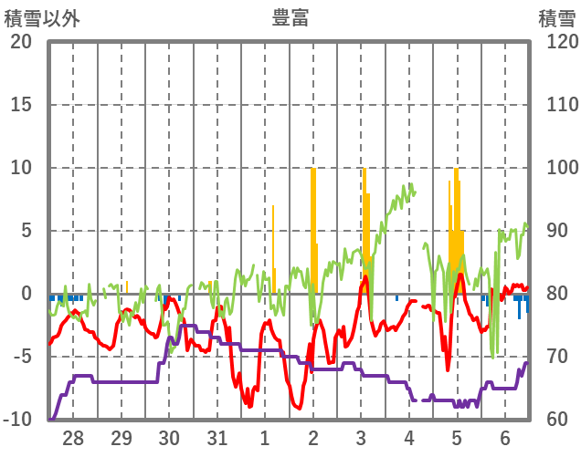 | 日 | 時 | 気温 | 降水 | 風向/風速 | 日照 | 積雪 | 降雪 |